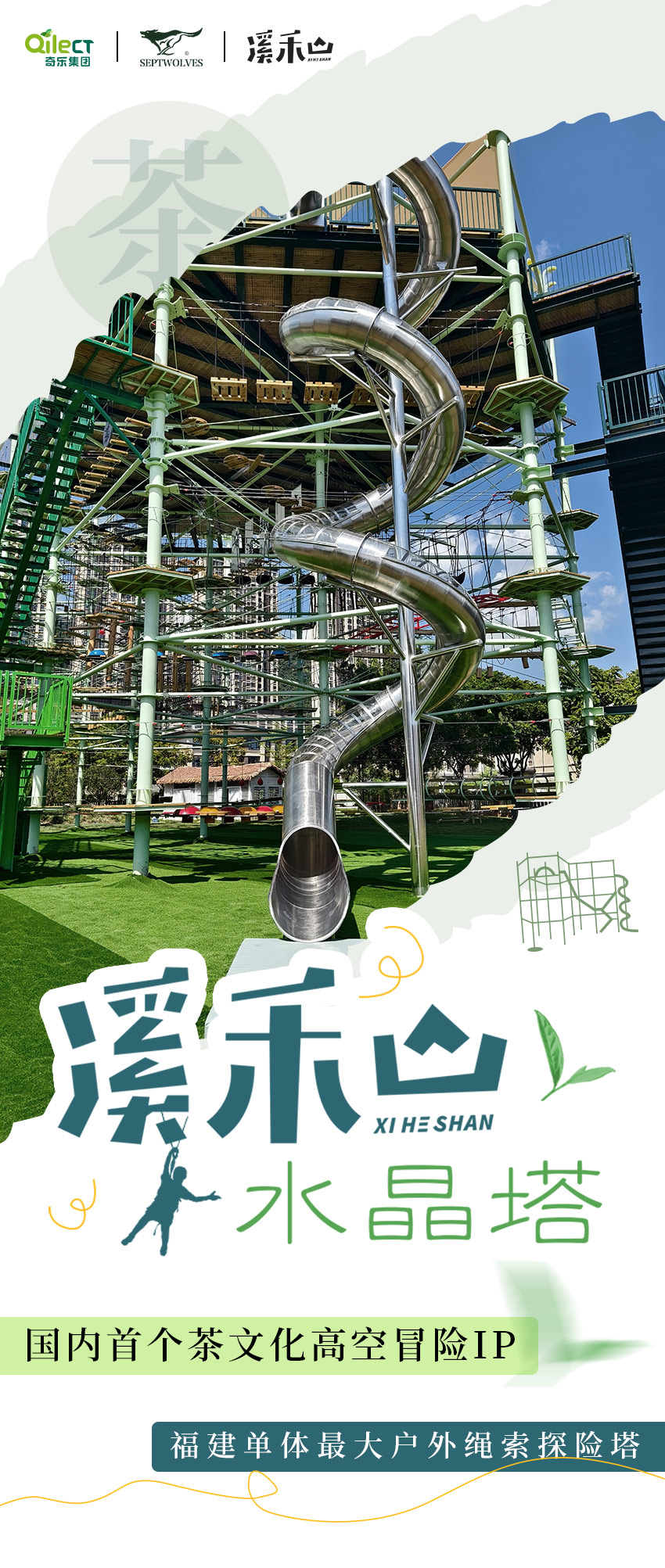 應(yīng)溪禾山邀請,在園區(qū)內(nèi)打造一座以茶為靈感、以勇氣為內(nèi)核、具有區(qū)域名片效應(yīng)和市場經(jīng)濟價值的首個茶文化高空冒險IP——溪禾山水晶塔。