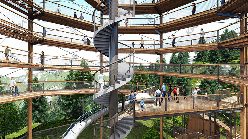 1、塔長23米,寬23米,高25米,由八根立柱圍合成正八邊形; 2、售票處位于塔體外側,并設有鋼構樓梯,上行8米到達一層平臺; 3、一層平臺往上可通過螺旋木棧道到達塔頂,棧道分五層,每層高三米; 4、一層平臺處設有旋轉滑梯,可劃至塔底,滑梯直徑0.95米,總長33米; 5、底層設有臨時商店,可為游客提供簡易餐飲; 6、出入口進行分流設計,避免擁堵,給游客營造一個良好的游玩環境,也方便景區管理。